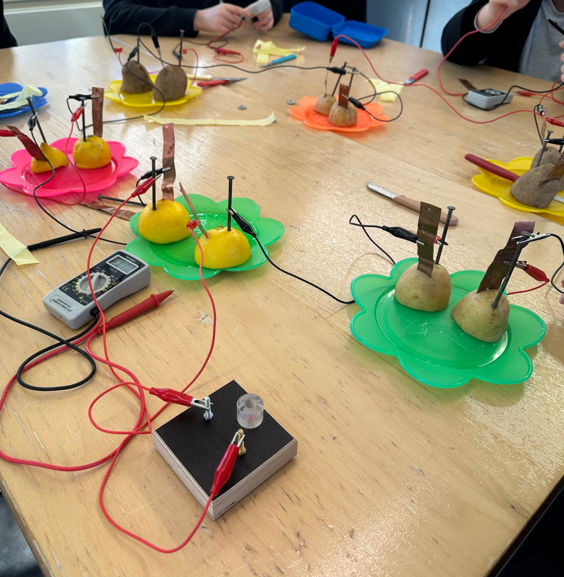 Mit einfachen Mitteln konnten die Jugendlichen selbst aktiv werden. Durch das Reiben von Luftballons entstand beispielsweise statische Elektrizität, die sofort beobachtet werden konnte. Ein echtes Highlight war der Bau einer eigenen Zitronenbatterie – dabei erzeugten die Schülerinnen und Schüler tatsächlich Strom aus einer Zitrone. Dazu wurden ein Zinknagel und eine Kupferplatte in die Frucht gesteckt und miteinander verbunden. So entstand eine kleine elektrische Spannung, die eindrucksvoll zeigte, wie chemische Energie in elektrische Energie umgewandelt werden kann.